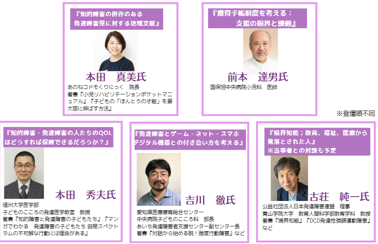 診断タイプ別ではなく、発達障害に普遍的にみられやすい知的機能や適応行動の支援について、今回も著名な講師の先生方をお招きして、それぞれの視点で講義をいたします。さらに、今回初めての企画として、境界知能の当事者と家族に登壇いただき体験談をお話しいただきます。